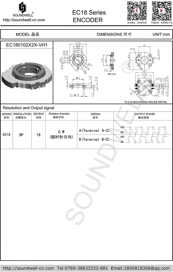 | Main Specifications: | Dimensions: ∮18mm Rated voltage: DC 5V Number of detent: 18 Pulses: 9 Operating temperature: -40°C~85°C Rotational life: 50,000 cycles Min |