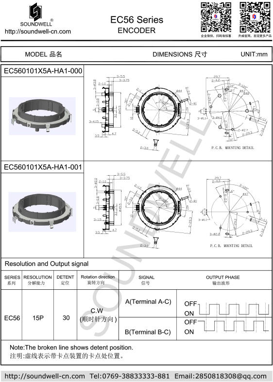 Dimensions: φ56mm Rated voltage: DC 5V Number of detent: 30 Pulses: 15 Working temperature: -40℃~85℃ Rotational life: 30,000 cycles Min |