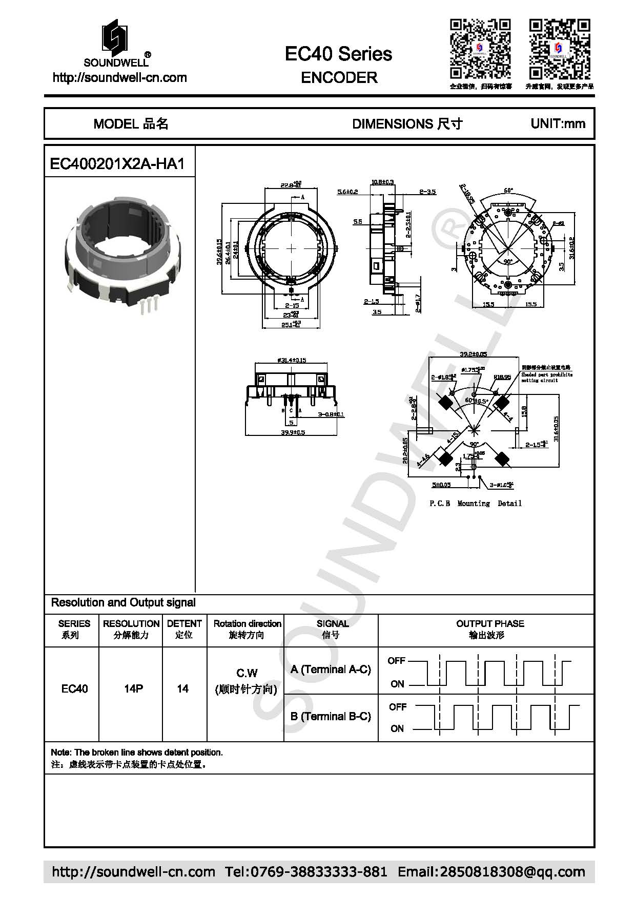 Dimensions: φ40mm Rated voltage: DC 5V Number of detent: 14 Pulses: 14 Rotational torque: 450±150gf.cm Rotational angle: 360° Working temperature: -40℃~85℃ Rotational life: 30,000 cycles Min |